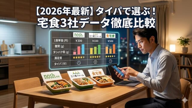 宅食比較 【2026年最新】タイパで選ぶ!人気宅食3社(nosh・三ツ星ファーム・食宅便)徹底数値比較 【2026年最新】nosh(ナッシュ)、三ツ星ファーム、食宅便の3社を「タイパ」視点で徹底比較。1食あたりの最安値や栄養素、片付けのしやすさを数値化してまとめました。4月から新生活を始める忙しいサラリーマンが選ぶべき、最強の宅食がデータで分かります。 2026.03.16 宅食比較